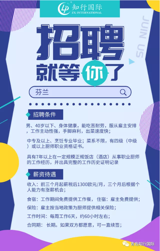 芬蘭始終作為歐洲最知名的國(guó)家之一,其高度發(fā)達(dá)的中餐業(yè),在整個(gè)歐洲都是首屈一指。優(yōu)美的生活與工作環(huán)境,優(yōu)厚的工資福利待遇,一直吸引著國(guó)內(nèi)廚師前往芬蘭工作。青島知行國(guó)際公司從事出國(guó)勞務(wù)15年,積累了大量的經(jīng)驗(yàn),我們將竭誠(chéng)為您提供優(yōu)質(zhì)的出國(guó)服務(wù)!