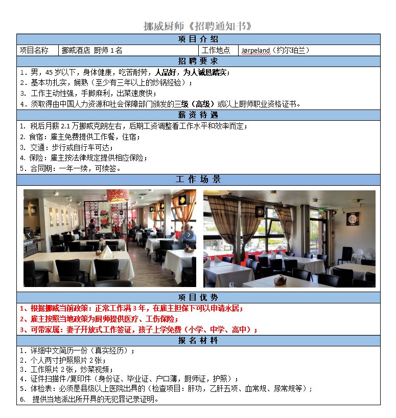 要求47歲以下、男性、高級(jí)廚師證、菜系不限,可獨(dú)立完成廚房全般工作,如烹飪、備貨、衛(wèi)生.稅后23000挪威克朗/月以上,有度假金