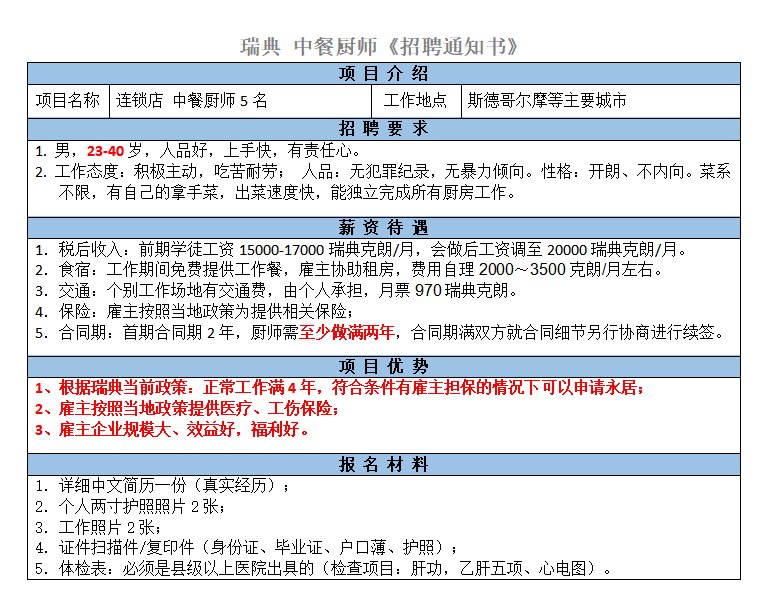 中餐廚師;菜系不限,熟練切配、炒鍋;取得中級廚師證或中級廚師證以上;起薪稅后20000瑞典克朗,后期視工作能力漲薪