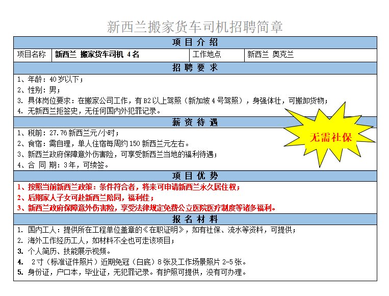 在搬家公司工作,有B2以上駕照(新加坡4號駕照),身強(qiáng)體壯,可搬卸貨物;無新西蘭拒簽史,無任何國內(nèi)外犯罪記錄。
