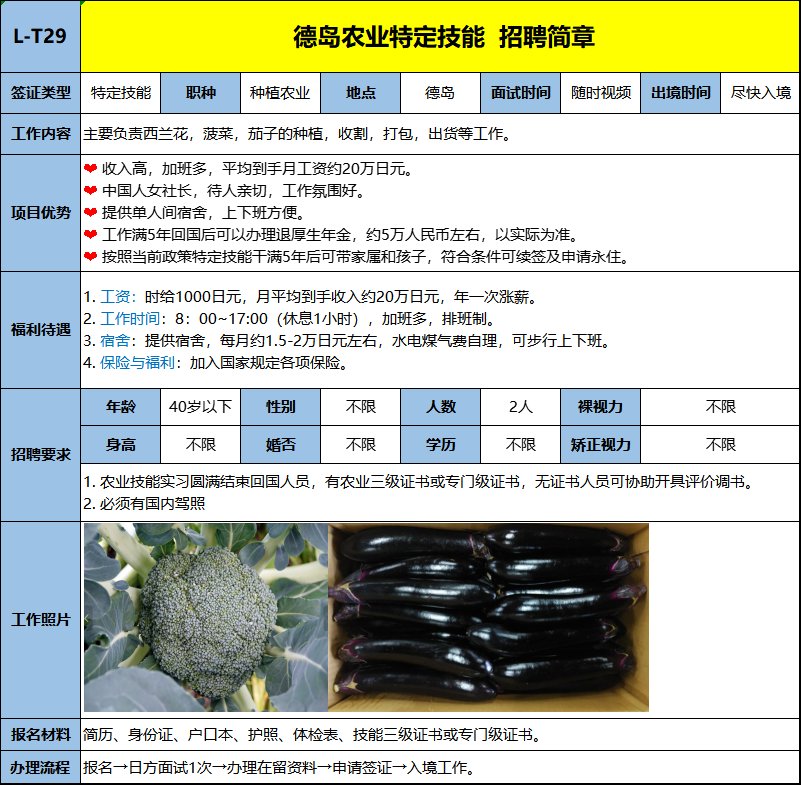 主要在大棚內(nèi)種植茄子,淡季時可以申請回國探親。 收入高,有25%加班費,目前在職前輩平均到手工資約20萬日元左右。