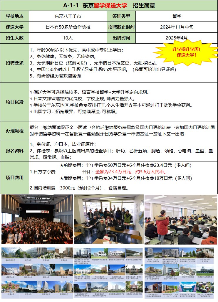 保送大學(xué)可選擇院校多,語言學(xué)校留學(xué)+大學(xué)升學(xué)定向規(guī)劃。日本文部省選定的優(yōu)良校,學(xué)校正規(guī), 師資力量強(qiáng)大。學(xué)校位于東京地區(qū),學(xué)校免費(fèi)安排打工,個(gè)人生活開支基本可通過打工及獎(jiǎng)學(xué)金獲得。出國(guó)學(xué)習(xí),拓寬眼界,可繼續(xù)深造, 可就職。