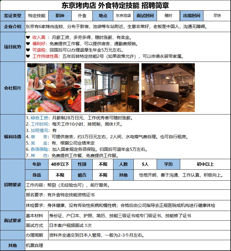 幫廚(無經(jīng)驗(yàn)也可)、前廳服務(wù),東京有6家烤肉連鎖,分布于新宿,池袋等車站附近,生意非常好,老板是中國人,溝通無障礙。