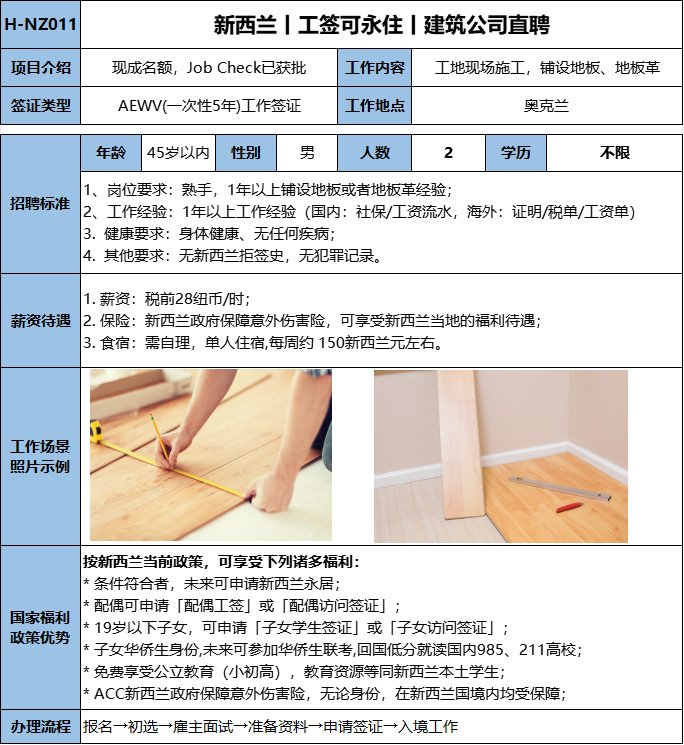 要求會熟練完成建筑木工工作,工作態(tài)度勤懇,服從指揮,稅前27.76新西蘭元/小時